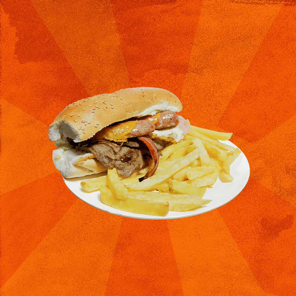 Pan con sésamo blanco, carne de lomito, tocino ahumado, chorizo, queso americano cheddar, huevo a la plancha, salsa de la casa, papas naturales, tomate y lechuga.