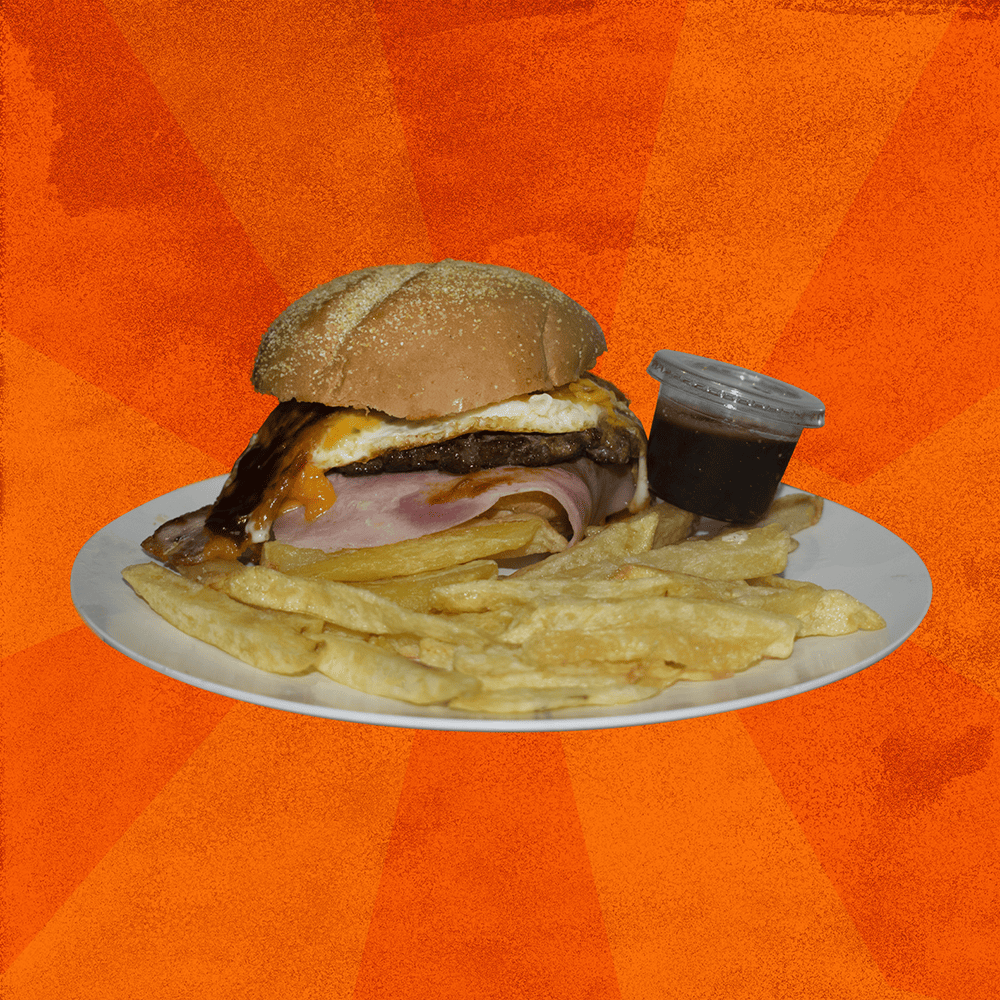 Pan brioche, carne, tocino ahumado, jamón york, queso americano cheddar, huevo a la plancha, salsa barbacoa, papas naturales, tomate y lechuga.